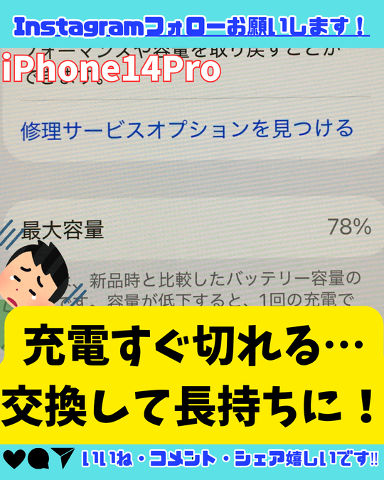 【iPhone14Pro】バッテリー劣化で充電切れ早い!修理しよう!