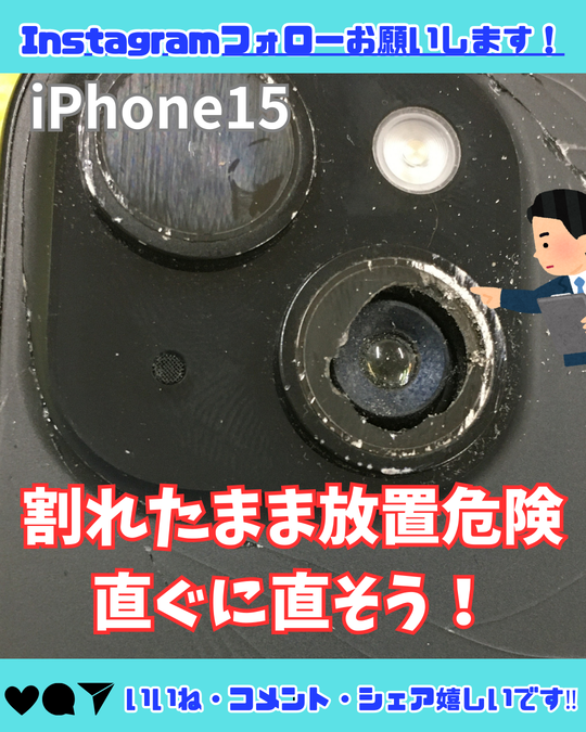 iPhone15は背面部分を開けての作業になるためヒビ、割れがある場合は割れが広がったりする可能性が高いです。